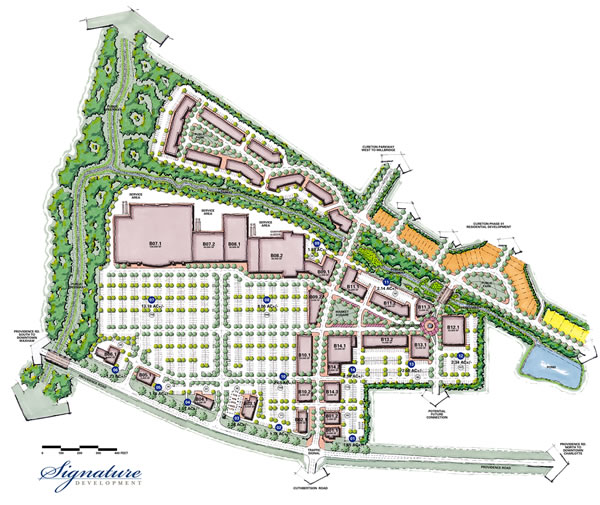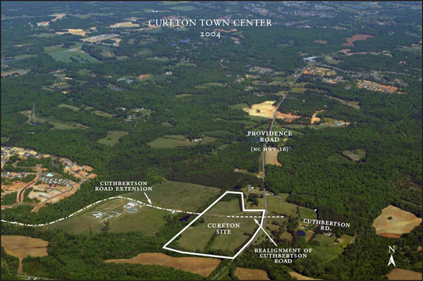 Located at the intersection of Providence Road and Kensington Drive, Cureton Town Center is planned for 435,000 square feet of retail and 60,000 square feet of office. Kensington Drive will ultimately be a significant east / west connector linking Hwy. 521 in south Mecklenburg to Monroe. The first phase of Cureton Town Center opened in March 2007 and is anchored by a 48,750 square foot Harris Teeter supermarket and includes 26,000 square feet of specialty retail shops and restaurants. CVS, SunTrust Bank and First Charter Bank are open on outparcels.